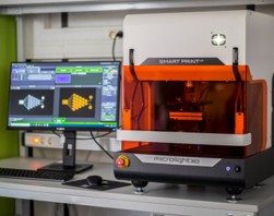 Smart Print UV is a maskless lithography equipment, based on a DMD projection technology, compatible with a wide range of resists and substrates. It can produce any 2D shapes at micron resolution (minimum feature size of 1.5 mm and alignment accuracy of 1 mm) without the need for a hard mask. It is perfectly designed for any application fields requiring surface micro patterning such as microfluidics, biotechnologies and microelectronics.